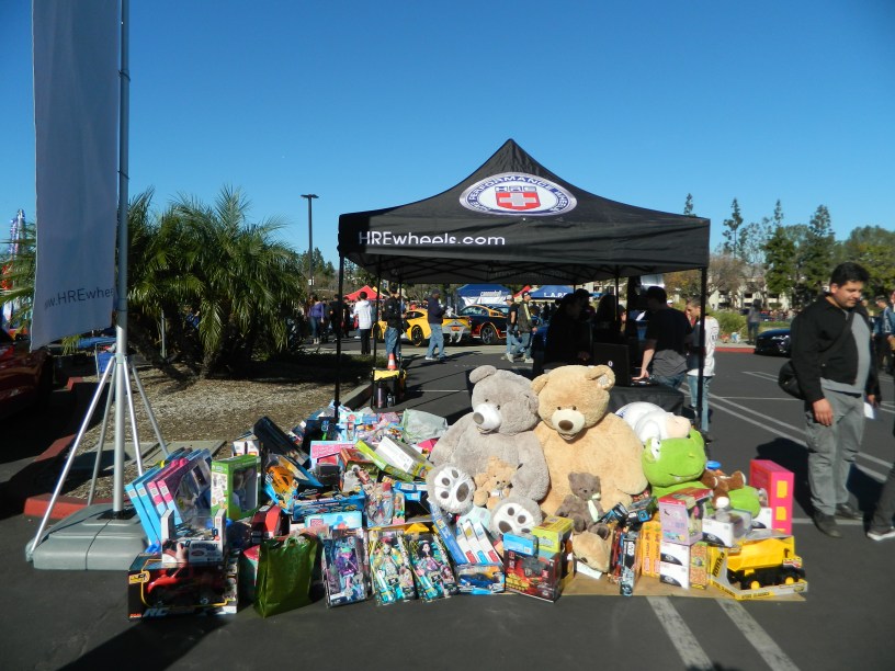 As I was cruising down the 210 Freeway, my mind was on automatic mode and I missed the 134 interchange. On my normal workday commute, I don’t merge until I reach the 5 Freeway. Even though my wife would probably disagree, I am sure this sort of thing happens to everyone, as we are creatures of habit. Since I had to re-route, I arrived a little later than I originally planned. As a result, the parking lots were filling up so I decided to park at the adjacent mall. During my short walk towards the event, I heard music, saw a couple of food trucks, numerous automotive vendors, and parking lots full of show cars. I walked passed the silent auction tables to reach the toy drop-off staion where volunteers were merrily accepting the donations. There were tons of toys gathered and more would be coming throughout the morning.